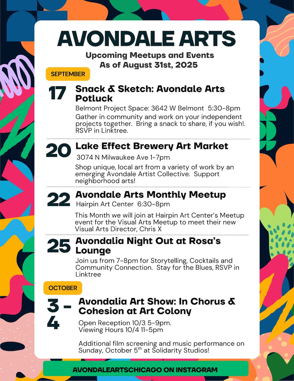 Avondalia, a community art show at the Arts Colony (2630 W Fletcher St, Chicago), is coming up on October 3rd (5pm-9pm central) and October 4th (11am-5pm central), and some of the work from my sculpture in the park series will be in the show. There will also be work by many other local Chicago artists, and I invite you to the show, connect with community, and experience/see great quality art.